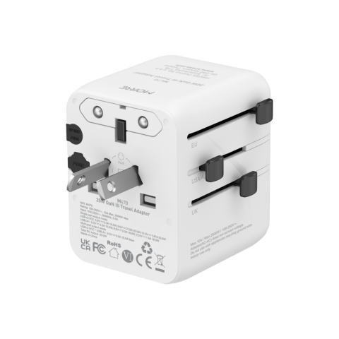 Adapter podróżny M470 to kompaktowe i niezawodne rozwiązanie dla osób często wyjeżdżających za granicę. Obsługuje standardy wtyczek USA/Japonia, Australia, UK oraz EU, dzięki czemu możesz korzystać z elektroniki praktycznie w każdym miejscu na świecie. Wymienne końcówki wysuwają się za pomocą intuicyjnych przycisków, co czyni adapter wygodnym i prostym w obsłudze.