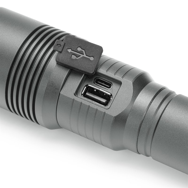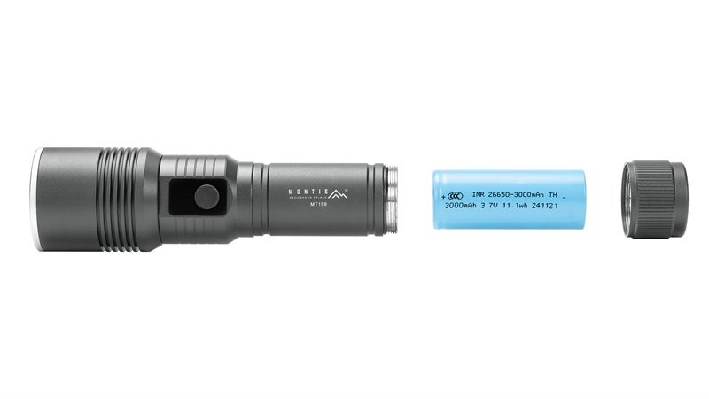 Źródłem energii latarki jest litowa bateria typu 26650 o napięciu 3,7V i pojemności 3000mAh, która zapewnia od 3 do 11 godzin pracy, w zależności od wybranego trybu jasności. Ładowanie odbywa się przez port USB typu C (5V/1A), a proces ten trwa od 4 do 5 godzin. Wbudowany wyświetlacz cyfrowy wskazuje dokładny poziom naładowania akumulatora w procentach, co pozwala na bieżąco kontrolować stan energii. Po pełnym naładowaniu latarka automatycznie przestaje pobierać prąd. Dodatkowym atutem jest możliwość korzystania z urządzenia jako powerbanku, dzięki portowi wyjściowemu USB-A (5V/1A), co umożliwia ładowanie np. smartfona w terenie.