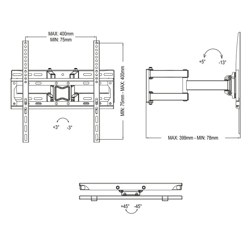Pełna regulacja uchwytu w pionie i poziomie oferuje bezproblemowe dostosowanie kąta widzenia do potrzeb widza. Niewątpliwie ogromną zaletą modelu MONT BLANC jest możliwość regulacji odległości ekranu od ściany w zakresie 60 – 330 mm.
